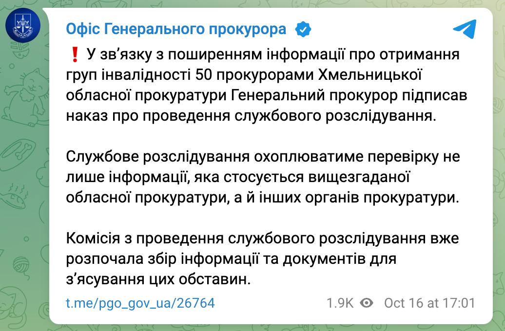 Днями ЗМІ повідомили, що майже півсотні хмельницьких прокурорів оформили інвалідність другої групи. Офіс генпрокурора заявив про початок розслідування цієї інформації.