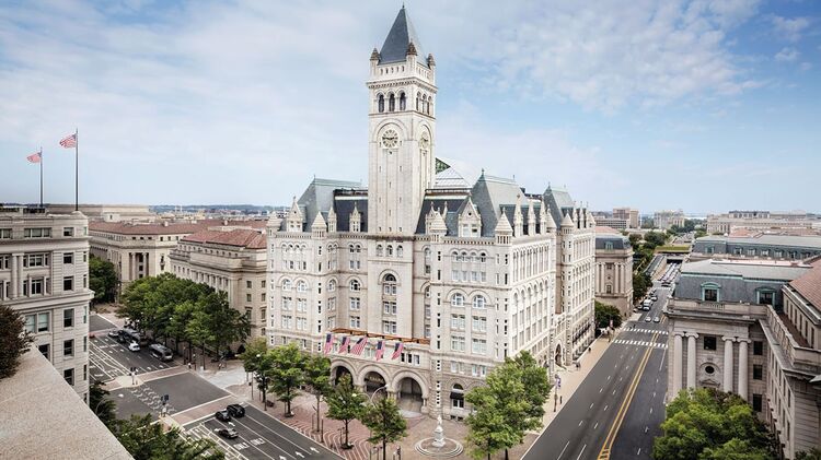 The Trump International Hotel був розташований у будівлі колишнього поштамту в центрі Вашингтона. У 2022 році Трамп продав п'ятизірковий готель і тепер він працює під брендом Waldorf Astoria, що входить до мережі готелів Hilton.