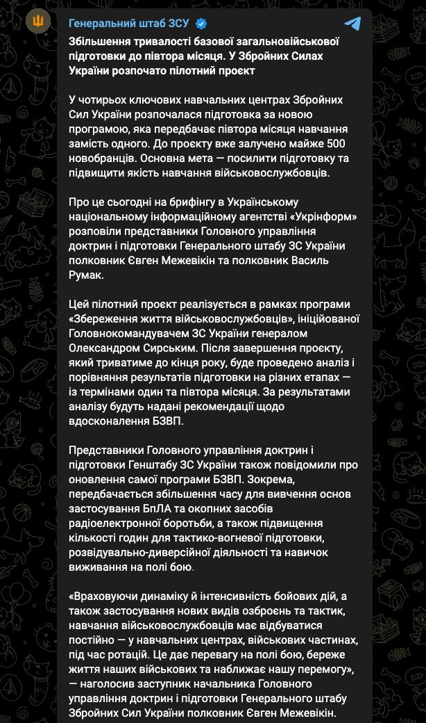 Поки що це буде пілотний проект у чотирьох навчальних центрах, де терміни навчання продовжать для 500 новобранців. Він триватиме до кінця року, після чого досвід можуть поширити на всі ЗСУ.
