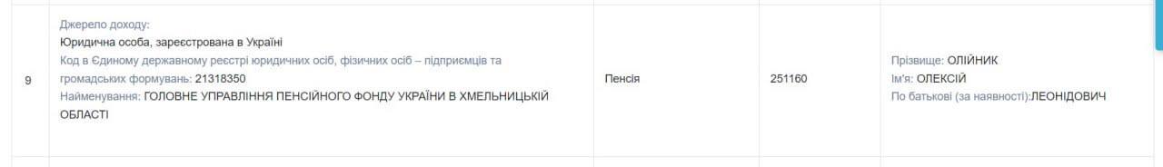 Керівник Хмельницької обласної прокуратури Олексій Олійник, який опинився у центрі скандалу з інвалідностями, отримував державну пенсію від Пенсійного фонду України з 2017 року, і її розмір за 7 років зріс у 7 разів.