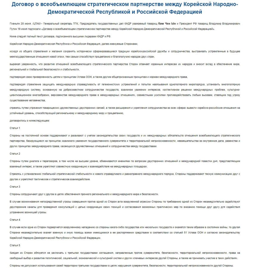 "У разі, якщо одна із Сторін зазнає збройного нападу з боку будь-якої держави або кількох держав і виявиться таким чином у стані війни, то інша Сторона негайно надасть військову та іншу допомогу всіма наявними у її розпорядженні засобами відповідно до статті 51 Статуту ООН і згідно із законодавством Корейської Народно-Демократичної Республіки та Російської Федерації", - так дослівно говорить 4 стаття договору.
