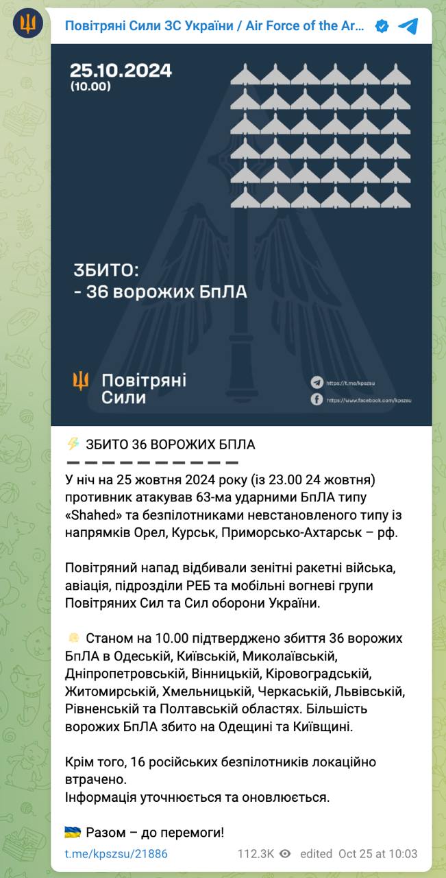 10.11 Повітряні сили повідомляють, що вночі збили 36 "Шахедів" із 63.