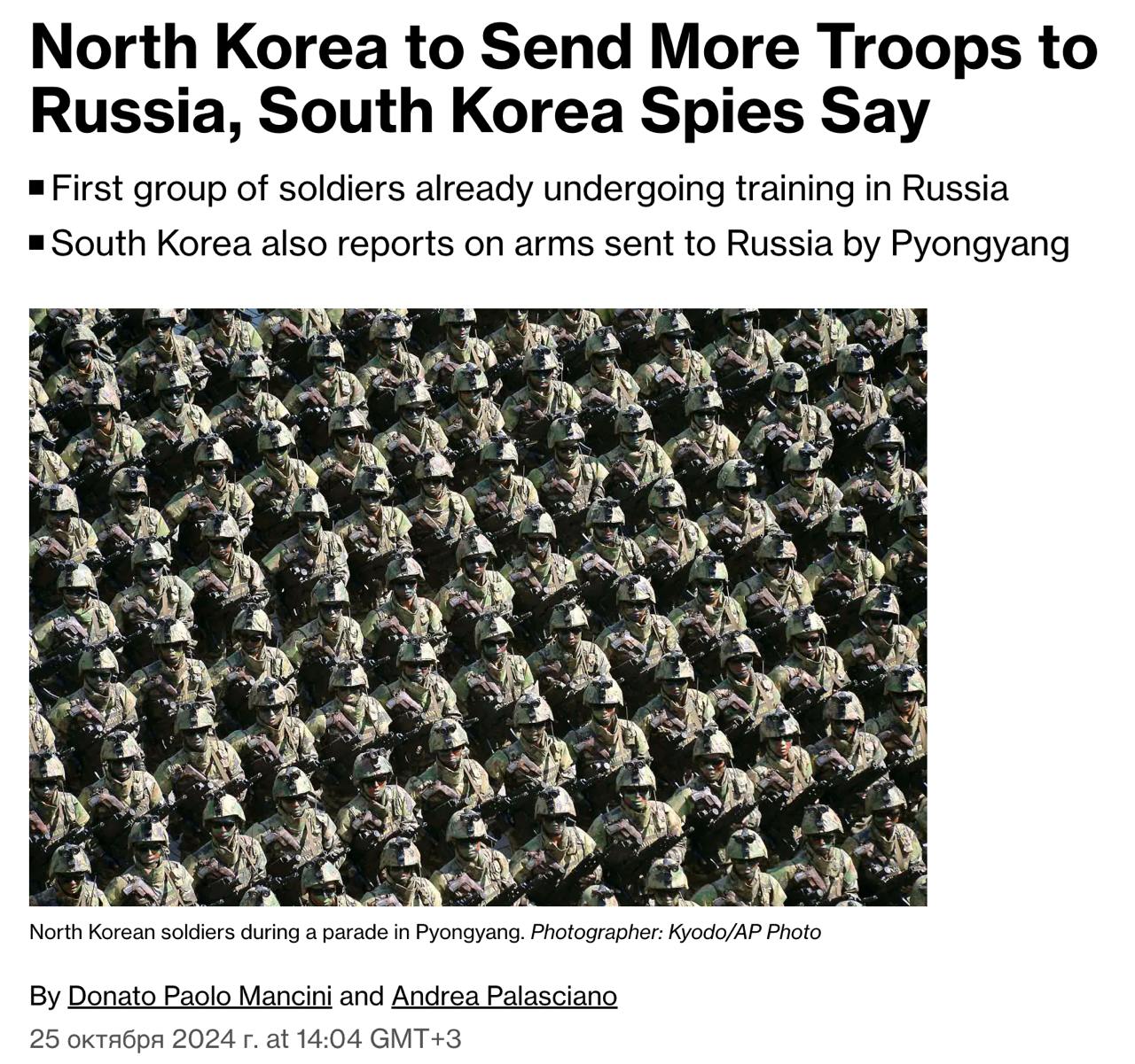 19:14 Друга група північнокорейських військових найближчим часом вирушить до Росії, пише Bloomberg з посиланням на документи південнокорейської розвідки, якими Сеул поділився з союзниками цього тижня.
