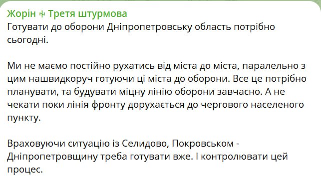 "Готувати до оборони Дніпропетровську область треба сьогодні. Ми не повинні постійно рухатися від міста до міста, паралельно з цим нашвидкуруч готуючи ці міста до оборони. Все це потрібно планувати, і будувати міцну лінію оборони завчасно. А не чекати, доки лінія фронту рухається у черговий населений пункт", – написав Максим Жорін у своєму ТГ-каналі.