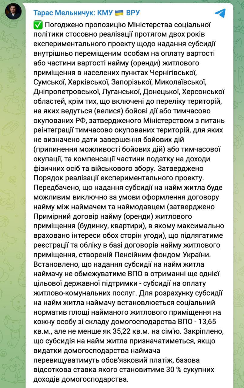 Для розрахунку субсидії на оренду житла встановлюється соціальний норматив площі житлового приміщення, що знімається, на кожну особу: 13,65 кв.м, але не менше 35,22 кв.м на сім'ю. Субсидію призначать, якщо витрати перевищуватимуть обов'язковий платіж, базова відсоткова ставка якого становитиме 30 % сукупних доходів домогосподарства.