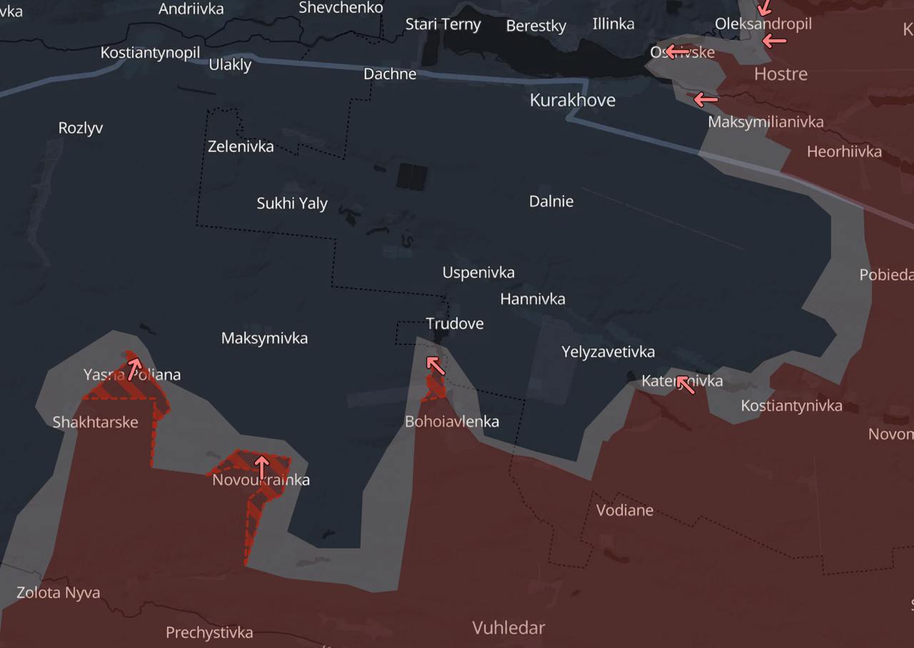 Раніше ми підбивали підсумки попереднього дня війни. Військовий паблік Deep State повідомив, що російські війська на Донеччині продовжують наступати з півдня на північ - з боку Вугледару та Золотої Ниви. Там вони просунулися біля Ясної Поляни, Богоявленки та Катеринівки. Ясна Поляна - це напрям на Константинополь, що знаходиться на трасі, що веде із заходу в Курахово.