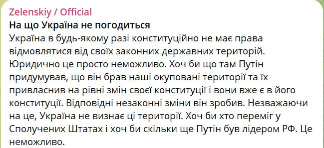 "Юридично це просто неможливо. Що б там Путін не вигадував, що він брав наші окуповані території та їх привласнив на рівні змін своєї конституції, і вони вже є у його конституції. Відповідні незаконні зміни він зробив. Незважаючи на це, Україна не визнає ці Хто б не переміг у Сполучених Штатах, і скільки б ще Путін не був лідером РФ, це неможливо», – сказав український президент.