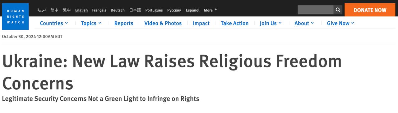 Міжнародна правозахисна організація Human Rights Watch (HRW) розкритикувала український закон, який відкриває шлях до заборони Української православної церкви (УПЦ).