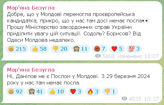 "Добре, що в Молдові перемогла проєвропейська кандидатка, прикро, що у нас там досі немає посла. Прошу Міністерство закордонних справ України приділити увагу цій ситуації. Содоль? Борисов? Від Одеси Молдова недалеко. Ні, Данилов не посол у Молдові. З 29 березня 2024 р. у нас там немає посла", - сказано у публікаціях Безуглої.
