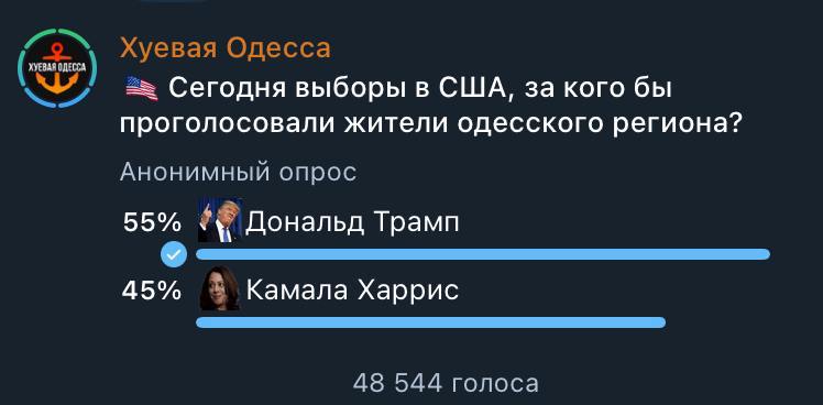 20:55 Популярний одеський паблік проводить опитування, за кого проголосували б читачі на виборах у США. Із майже 50 тисяч тих, хто проголосував, 55% підтримують Дональда Трампа. У Харріс, відповідно, 45%.