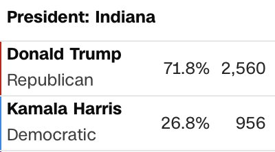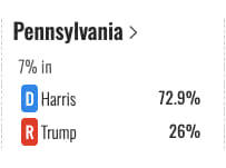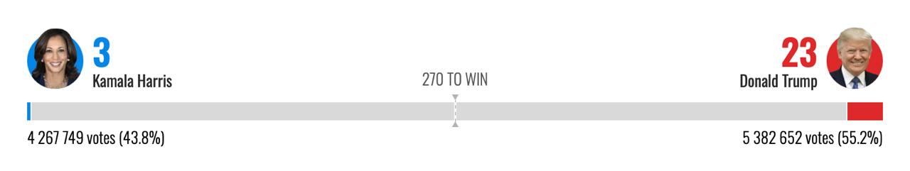 За результатами 13% підрахованих голосів він набирає там 31,8%, Харріс — 67,3%.