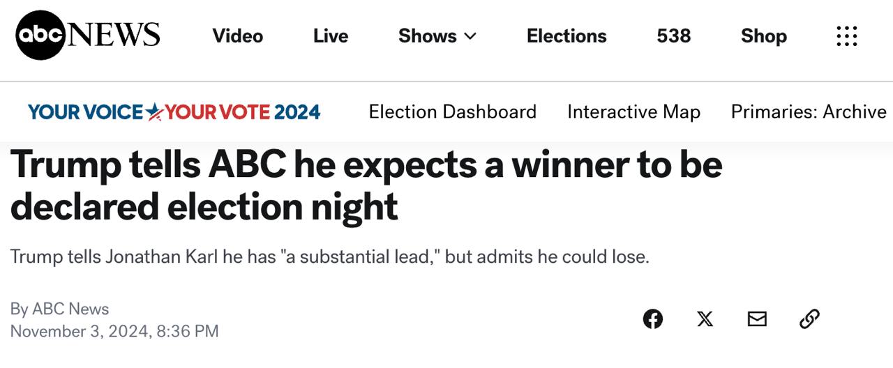 "Так, я думаю, ви знаєте. Я думаю, ви можете програти. Я маю на увазі, це трапляється, вірно? Але я думаю, що у мене досить суттєва перевага, але, можна сказати, так, ви можете програти. Можуть статися погані речі. Знаєте, речі трапляються, але це буде цікаво", - заявив республіканець ще 3 листопада в інтерв'ю телеканалу ABC News.
