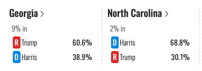 02:39 Поки Трамп продовжує лідирувати в Джорджії (де в нього вже понад 60%), Харріс лідирує в ще одному штаті, що вагається, - Північній Кароліні (майже 69% за підсумками підрахунку 2% голосів).