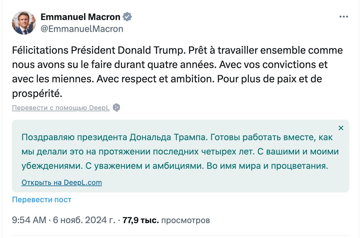 "Ми збираємося працювати над створенням більш єдиної, сильнішої та сувереннішої Європи в нових умовах. Співпрацюючи зі Сполученими Штатами Америки та захищаючи наші інтереси та наші цінності", - пише Макрон.