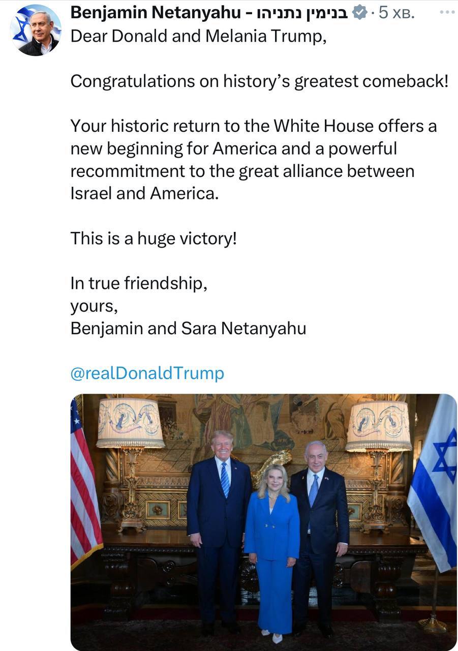 10.05 Прем'єр Ізраїлю Нетаньяху також вітає Трампа.