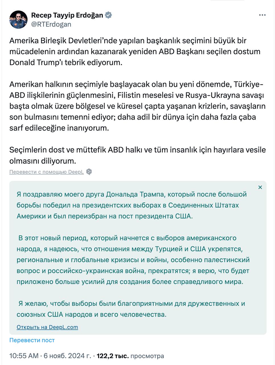 «Я сподіваюся, що відносини між Туреччиною та США зміцняться, регіональні та глобальні кризи та війни, особливо палестинське питання та російсько-українська війна, припиняться; я вірю, що буде докладено більше зусиль для створення справедливішого світу», - написав президент Туреччини.