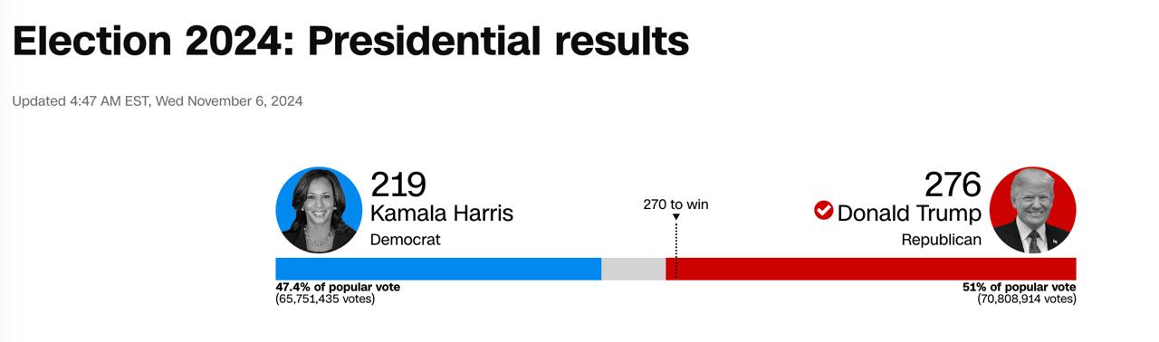 За даними CNN, у республіканця вже 276 голосів виборців за 270 необхідних.