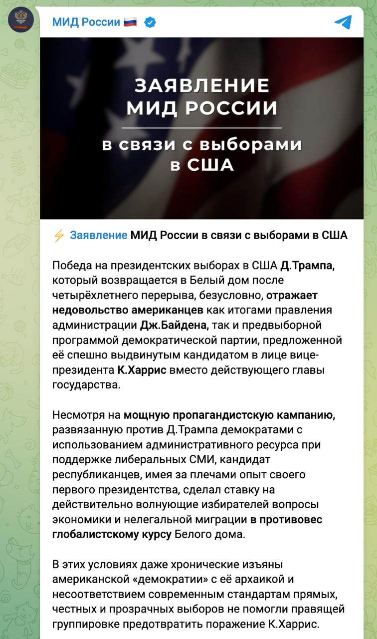 Також МЗС РФ стверджує, що повернення Трампа може "підштовхнути посилення внутрішньої напруженості та жорстокість протиборчих таборів" у Штатах.