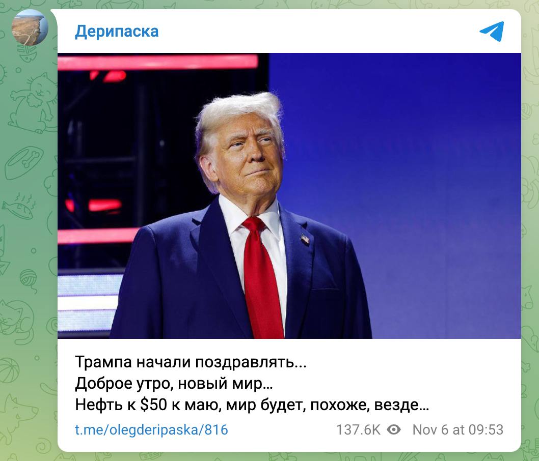 15:26 До травня нафта подешевшає до 50 дол. за барель і на планеті запанує світ, прогнозує російський олігарх Олег Дерипаска, коментуючи перемогу Трампа.
