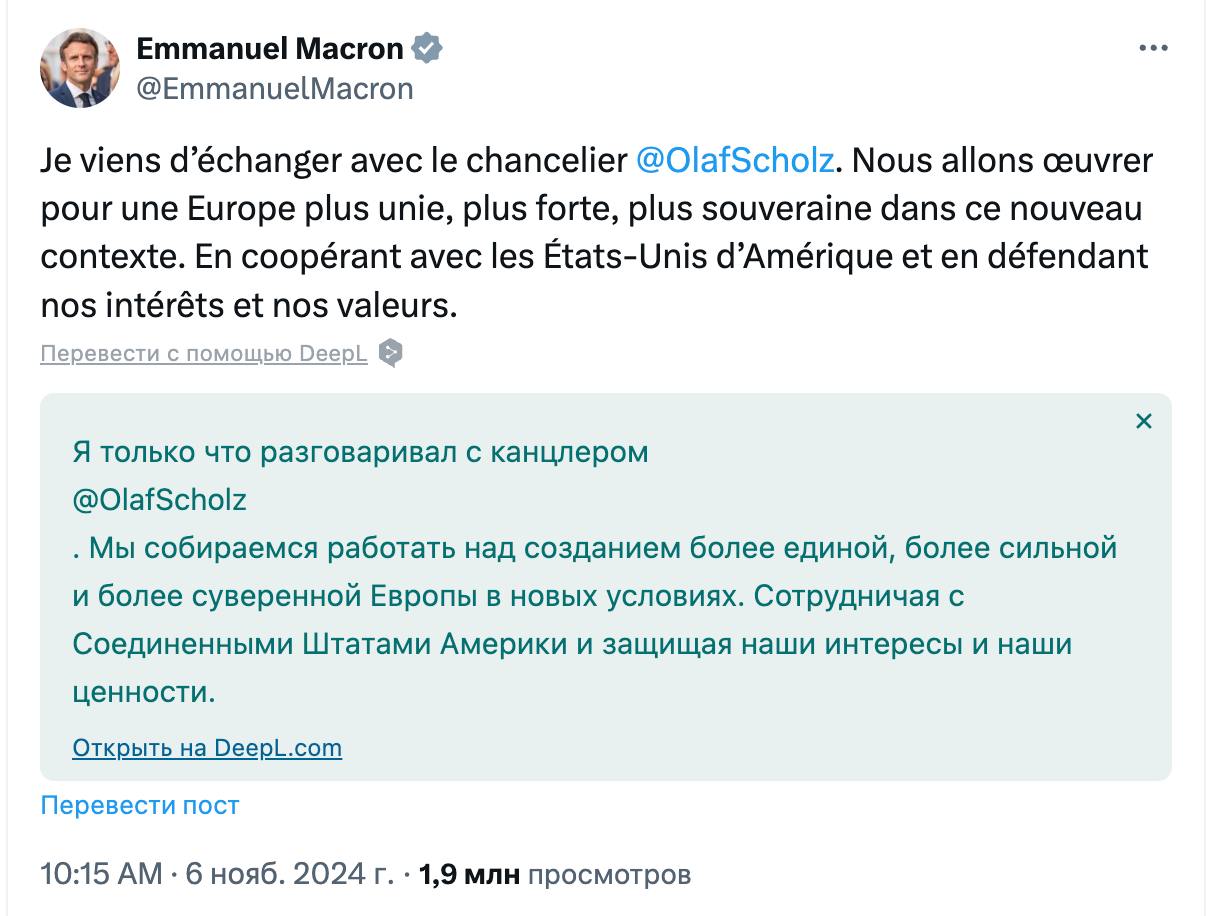 16:00 Макрон закликав країни ЄС домовитися про спільні кроки після перемоги Трампа, щоб не допустити принципу "кожен сам за себе".