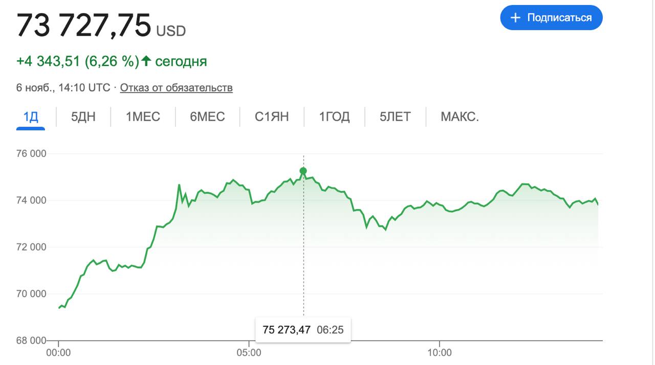 16.18 Біткоїн сьогодні вранці на тлі новин про перемогу Трампа досяг 75 тис. дол., встановивши новий історичний рекорд.