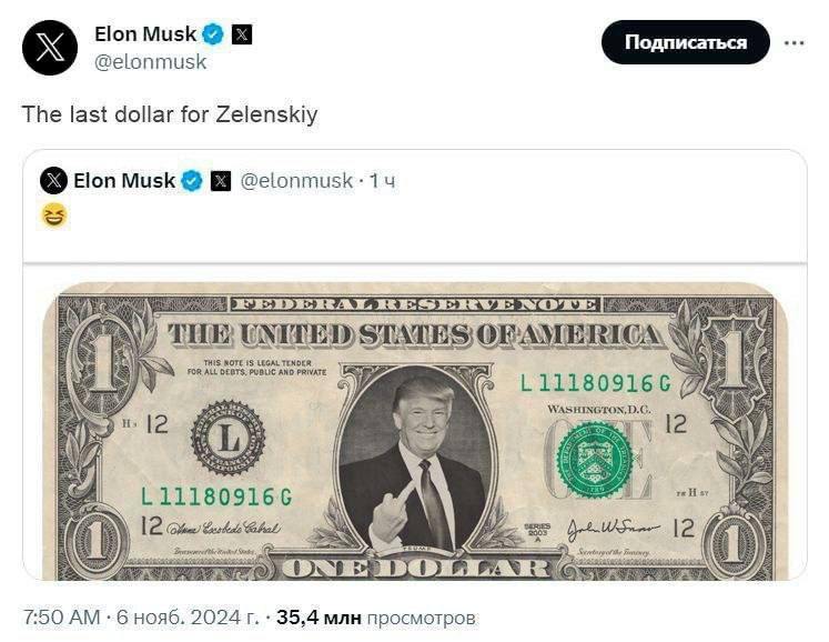 "Це останній долар для Зеленського", - нібито написав бізнесмен і опублікував фото долара, де Трамп усміхаючись показує середній палець.