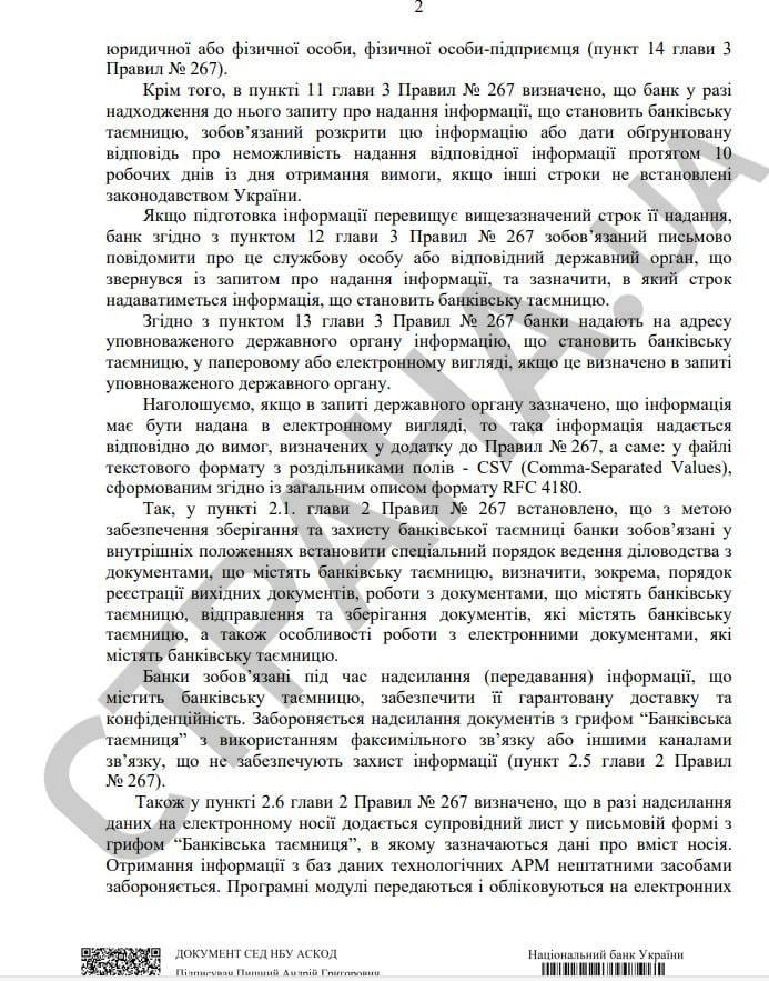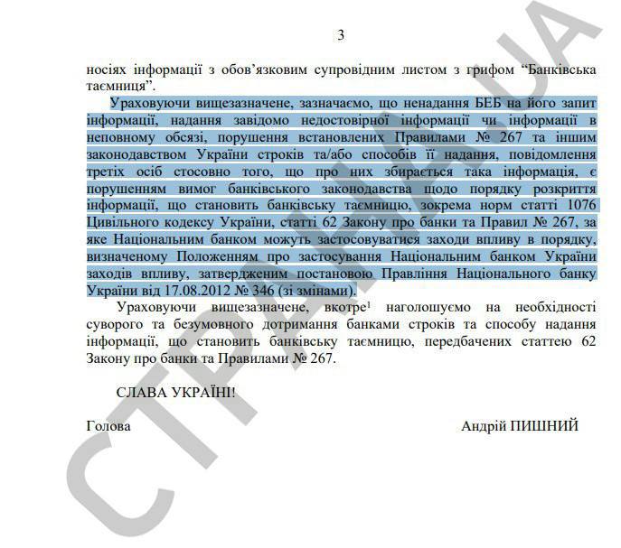 "Враховуючи вищесказане, зазначаємо, що ненадання БЕБ на його запит інформації, надання свідомо недостовірної інформації або інформації в неповному обсязі, порушення встановлених правилами №267 та іншим законодавством України строків та/або способів її надання, повідомлення третіх осіб щодо того, що про них збирається така інформація, є порушенням вимог банківського законодавства про порядок розкриття інформації, яка становить банківську таємницю, у тому числі норм статті 1076 Цивільного кодексу України, статті 62 закону про банки та правила № 267, за яким Національним банком можуть застосовуватися заходи впливу", - йдеться у повідомленні. у листі №24-0006/81883.
