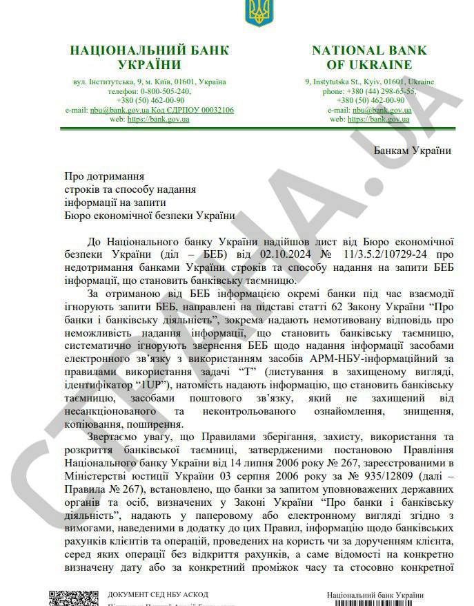 Про це йдеться у внутрішньому листі Нацбанку №24-0006/81883 із заголовком "Про дотримання термінів та способу надання інформації на запити Бюро економічної безпеки України", що опинився у розпорядженні "Страни".