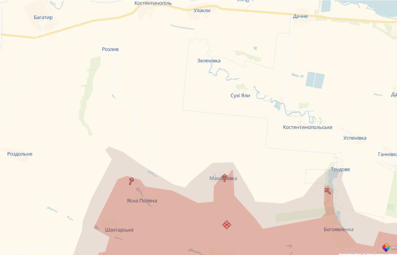 • змогли просунутися на північний захід від Богоявленки, тим самим перекриваючи трасу до Успенівки, і мають прямий вихід до Константинопольського.
