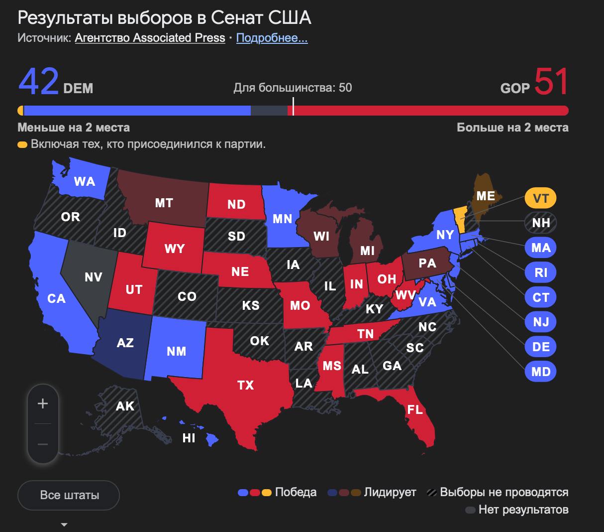 За даними Associated Press, партія кандидата в президенти США Дональда Трампа наразі отримує 51 місце в Сенаті, а демократи – 42.