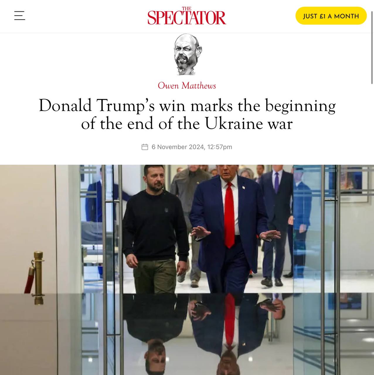 Журнал The Spectator опублікував статтю під заголовком "Перемога Дональда Трампа означає початок кінця війни в Україні".