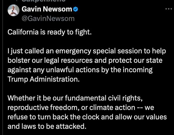 "Каліфорнія готова до боротьби. Я щойно скликав екстрену спеціальну сесію, щоб допомогти зміцнити наші правові ресурси та захистити нашу державу від будь-яких незаконних дій нової адміністрації Трампа", - написав Ньюсом у Х.