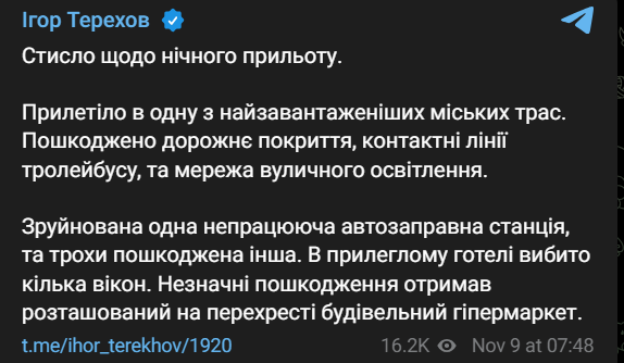Прилетіло до однієї із найбільш завантажених міських трас. Пошкоджено дорожні покриття, контактні лінії тролейбуса та мережу вуличного освітлення.