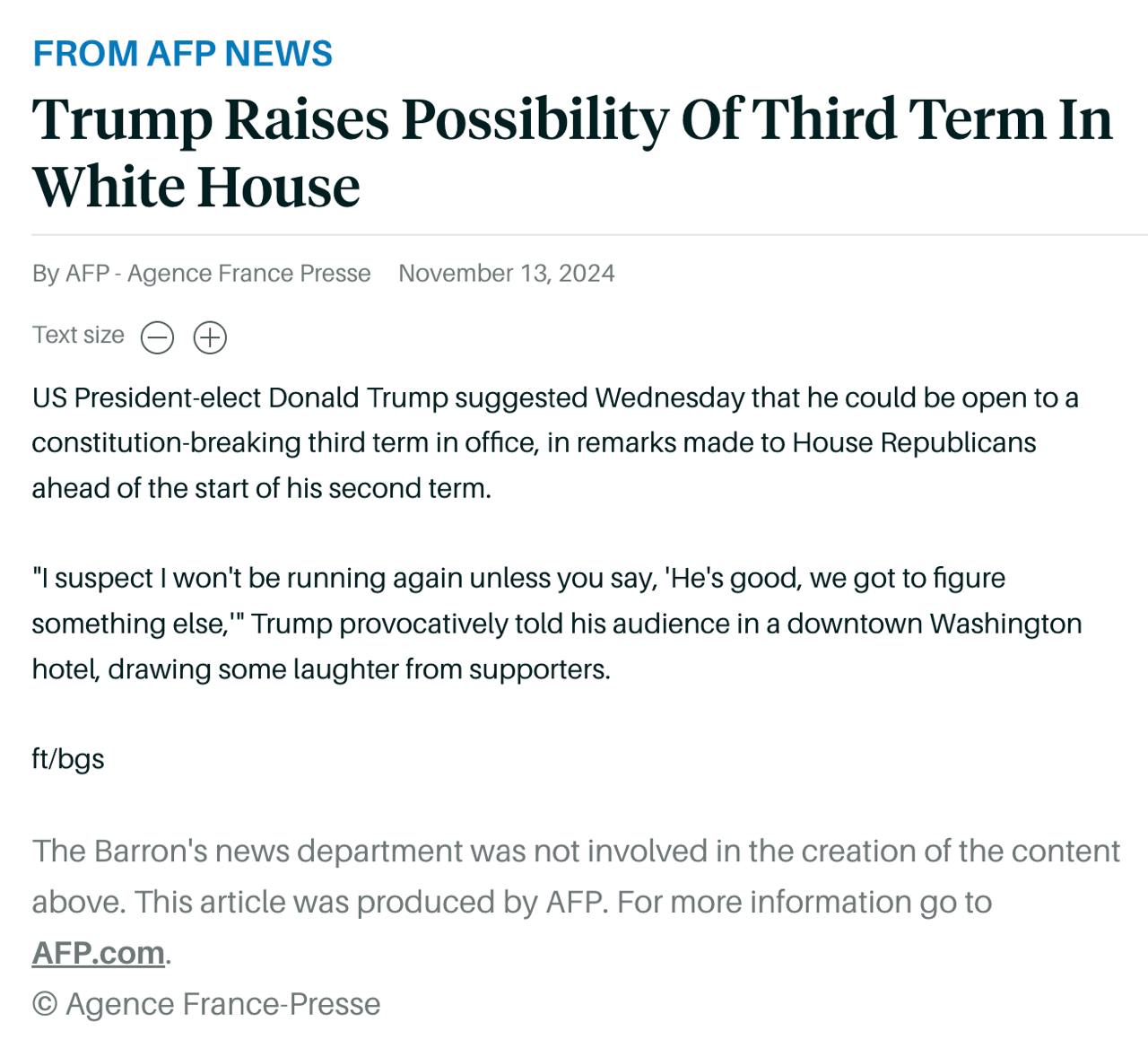 Обраний президент США Дональд Трамп припустив, що піде на третій термін.