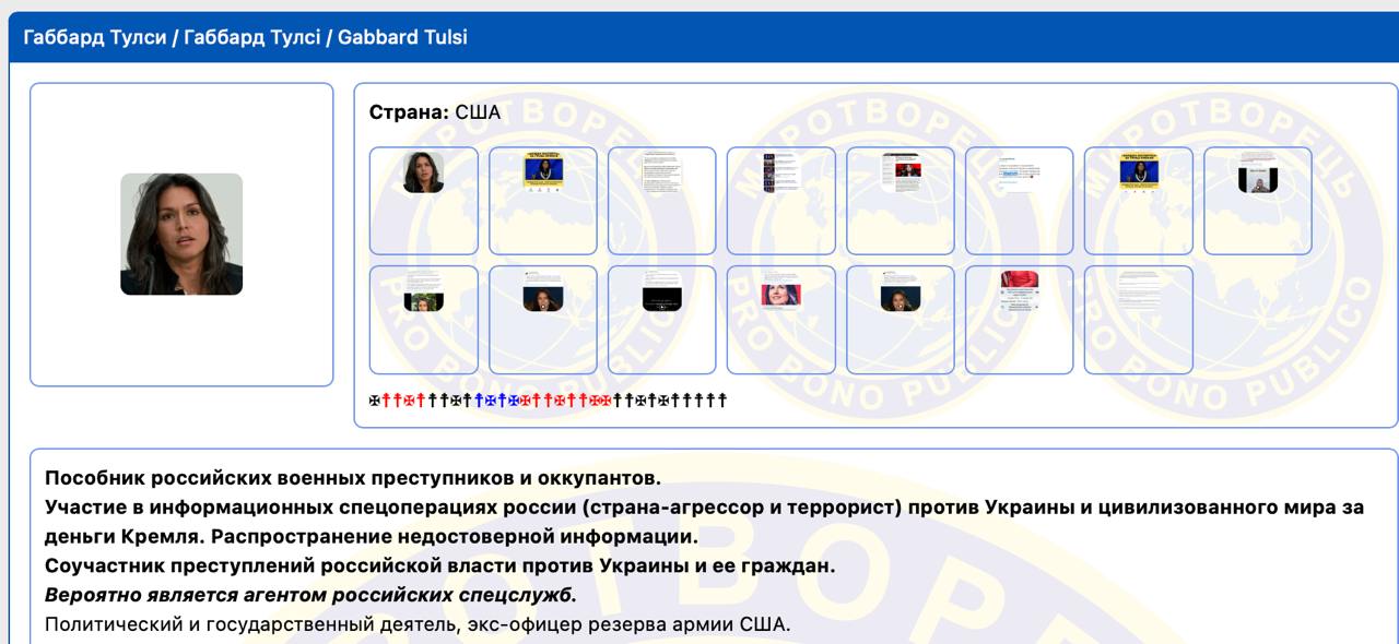 Також Габбард у квітні 2022 року внесли на "Миротворець" як "агента російських спецслужб". Це сталося рівно того ж дня, як американку розкритикував РНБО.