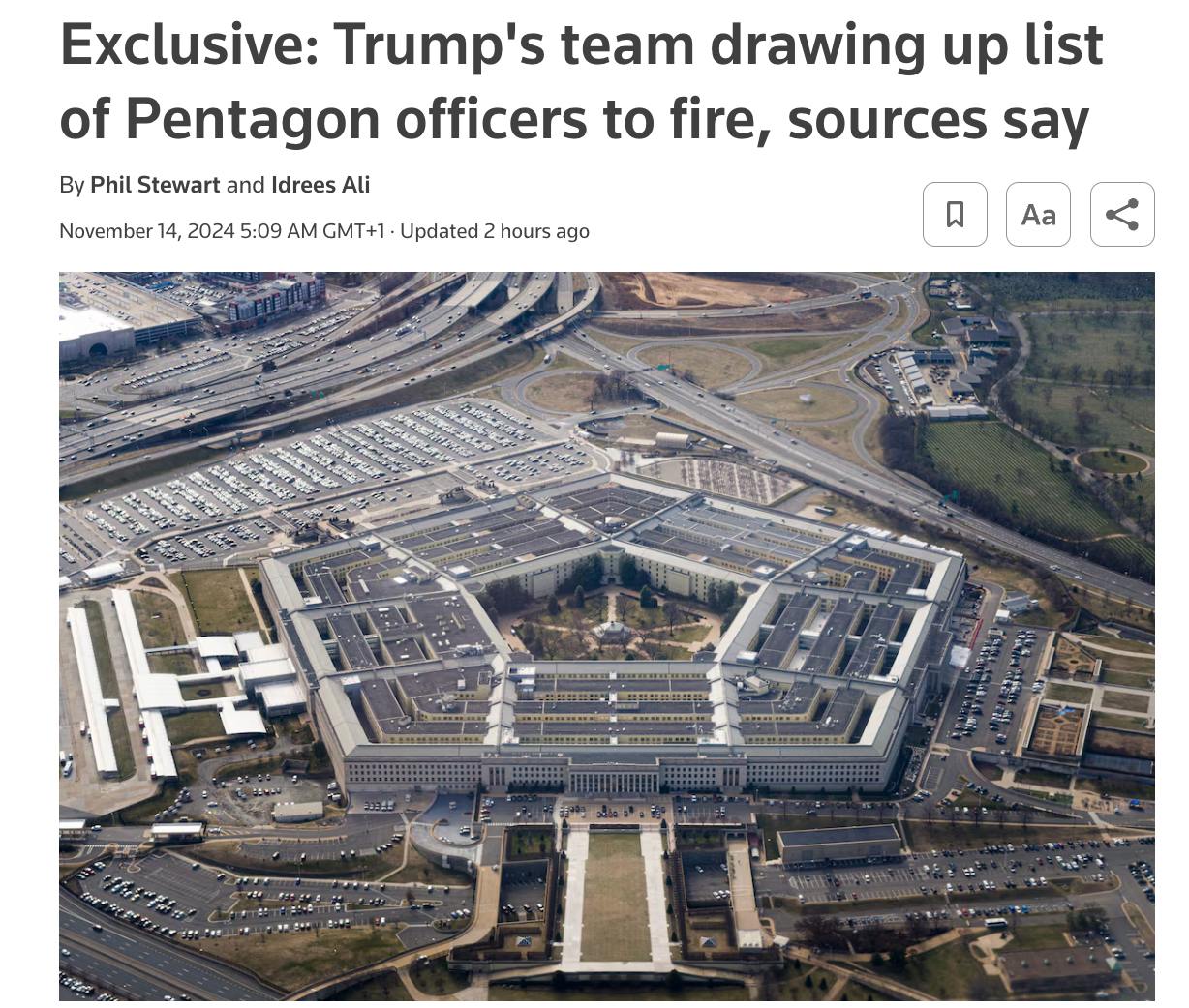 Агентство зазначає, що заклики "радикально переглянути вище керівництво Пентагону", включаючи персону нинішнього главу генштабу Чарльза Брауна, раніше висловлював Пітер Хегсет, якого Трамп учора висунув міністром оборони.