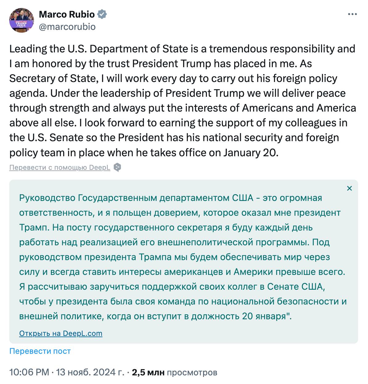 "Керівництво Державним департаментом США - це величезна відповідальність, і я задоволений довірою, яку надав мені президент Трамп. На посаді державного секретаря я щодня працюватиму над реалізацією його зовнішньополітичної програми. Під керівництвом президента Трампа ми забезпечуватимемо мир через силу і завжди ставитимемо інтереси американців та Америки понад усе. Я розраховую заручитися підтримкою своїх колег у Сенаті США, щоб у президента була своя команда з національної безпеки та зовнішньої політики, коли він обійме посаду 20 січня", - сказано в публікації Рубіо.