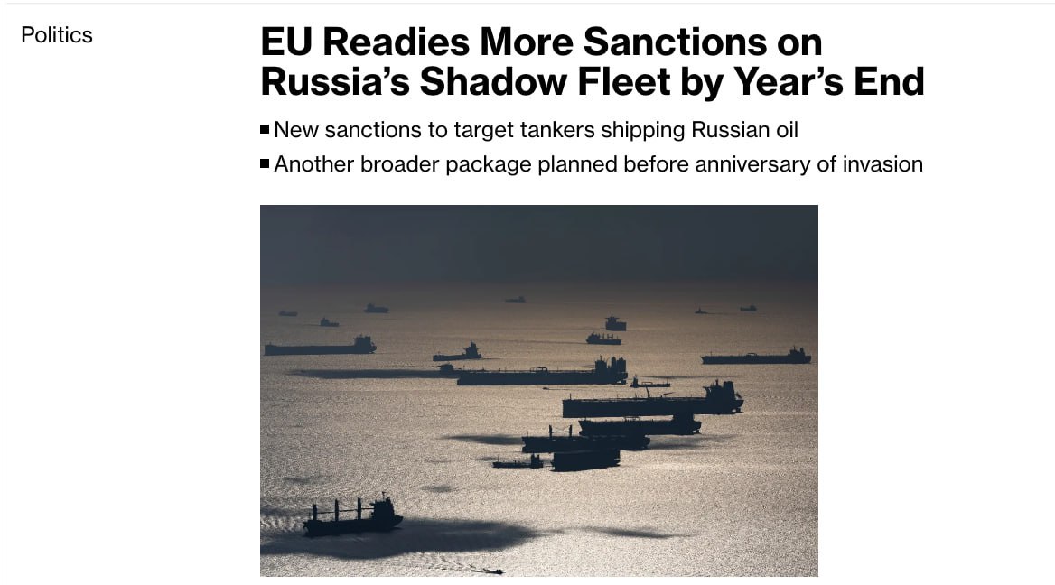 Агентство повідомляє, що про плани Євросоюзу "атакувати" "тіньовий флот" РФ, за допомогою якого вона експортує свою нафту, розповіли джерела. За їхніми словами, наступний пакет також включатиме санкції проти окремих осіб, які беруть участь у торгівлі. Обговорення обмежень, що входять до нового пакету, триває.