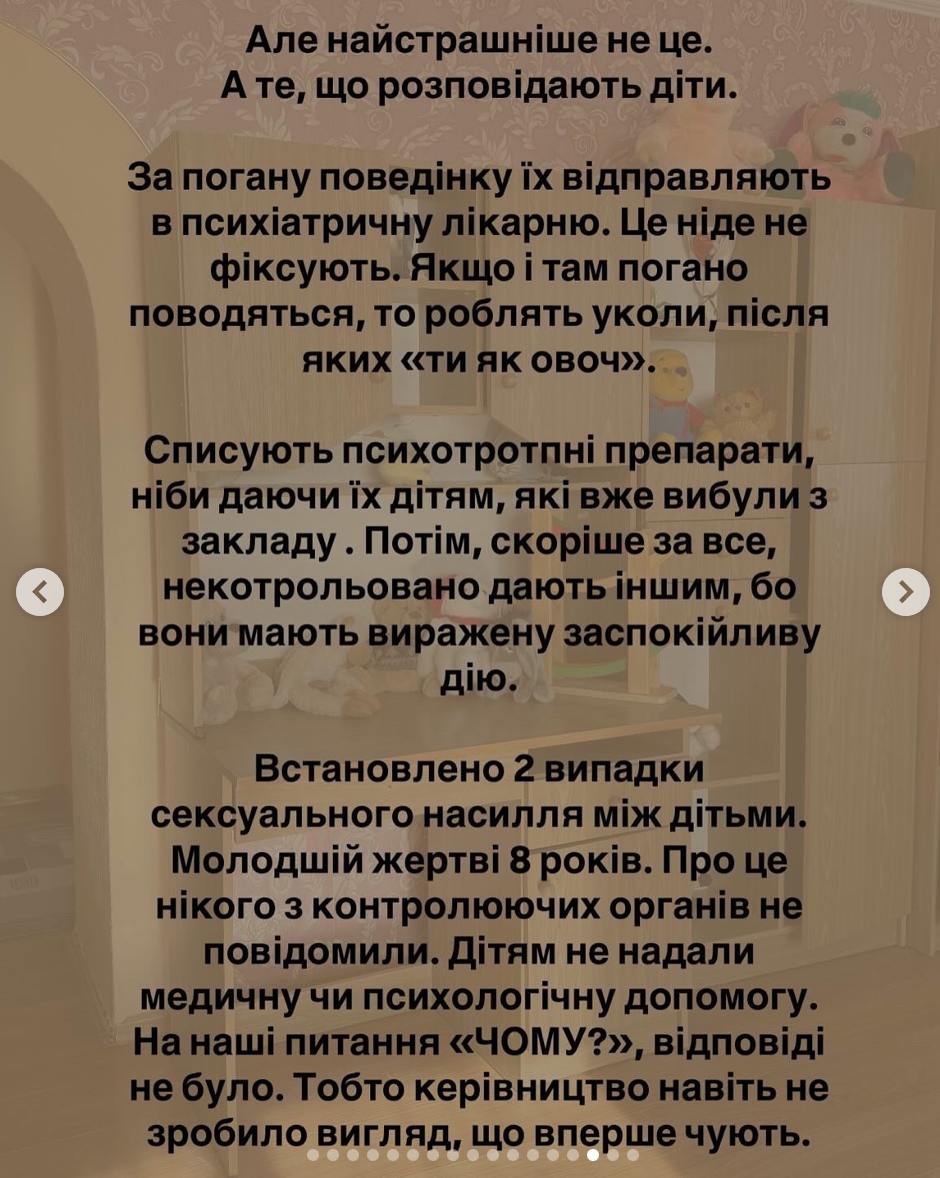 Також, за її словами, деяких дітей "за погану поведінку" відправляли до місцевої психіатричної лікарні, де без свідчення лікарів кололи сильнодіючі заспокійливі, після яких вони ставали "як овочі".