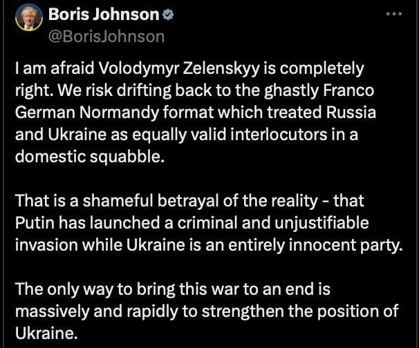 "Ми ризикуємо повернутися до жахливого франко-німецького "нормандського формату", який розглядав Росію та Україну як рівноправних співрозмовників у внутрішній сварці", - написав Джонсон.