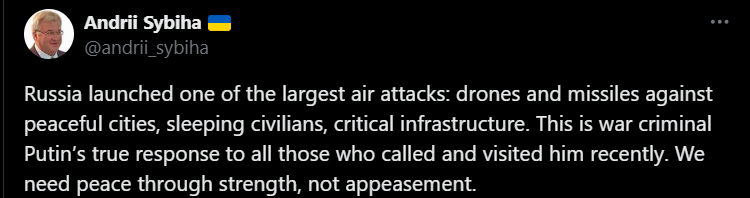 "Росія розпочала одну з найбільших повітряних атак: безпілотники та ракети проти мирних міст, сплячих мирних жителів, критично важливої інфраструктури. Це справжня відповідь військового злочинця Путіна всім тим, хто дзвонив і відвідував його нещодавно. Нам потрібен мир силою, а не умиротворенням", – написав він у соцмережі Х.