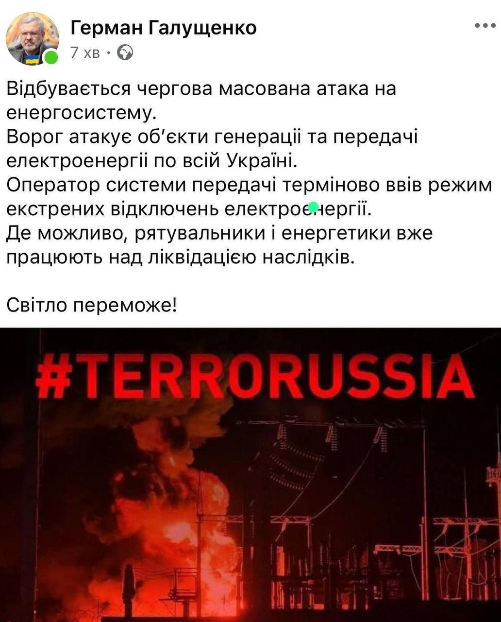 "Чергова масована атака на енергетичну систему. Ворог атакує об'єкти генерації та передачі електроенергії по всій Україні", - написав він у Facebook.