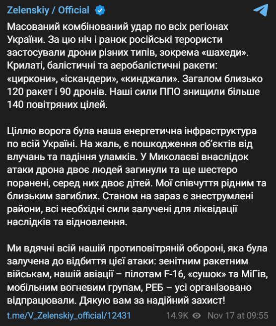 "Крилаті, балістичні та аеробалістичні ракети: циркони, іскандери, кинджали. Загалом близько 120 ракет та 90 дронів. Наші сили ППО знищили понад 140 повітряних цілей", - написав він.