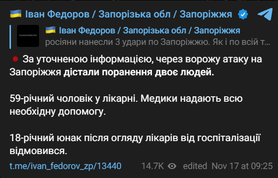 У Запоріжжі також були удари по інфраструктурі, повідомив голова ОВА Іван Федоров. Поранено двох людей, 59-річного чоловіка та 18-річного хлопця.