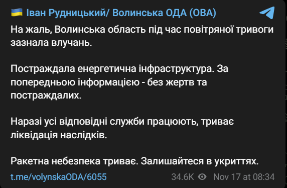 У Волинській області під час атаки пошкоджено енергетичну інфраструктуру, повідомив голова ОВА Іван Рудницький.