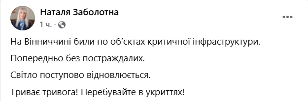 У Вінниці також били об'єктами критичної інфраструктури, повідомила замголови ОВА Наталя Заболотна.