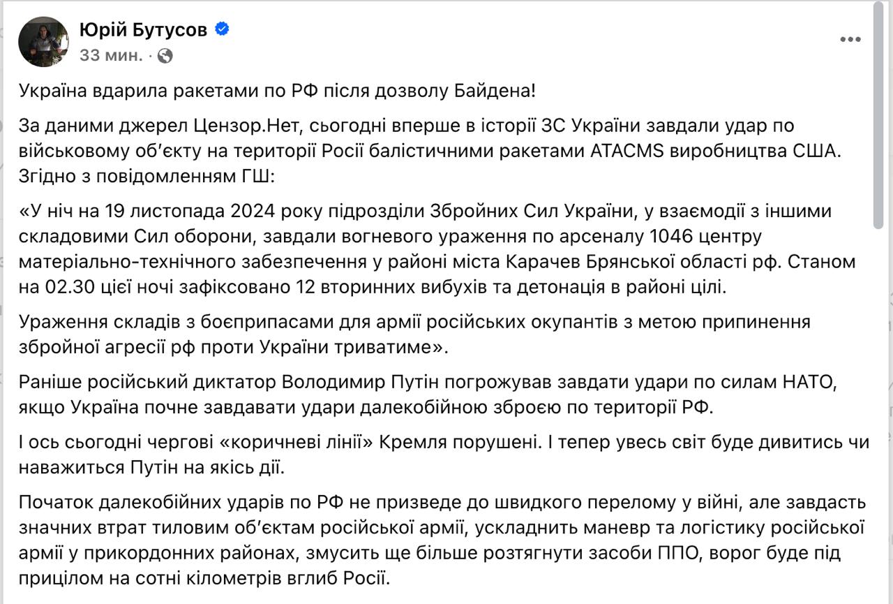 Не виключено, що повідомлення про удар американськими ракетами Брянської області Бутусов опублікував в режимі інформвійни для обґрунтування тези, про яку він пише в тому ж пості, - про "порушення чергових коричневих ліній Кремля".