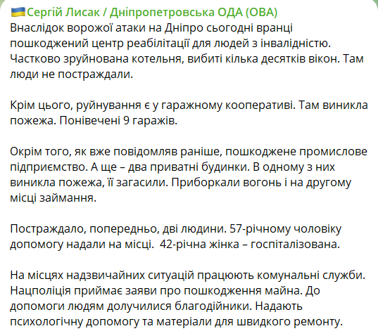Керівник Дніпропетровської ОВА Сергій Лисак повідомив, що внаслідок удару РФ постраждали двоє людей.