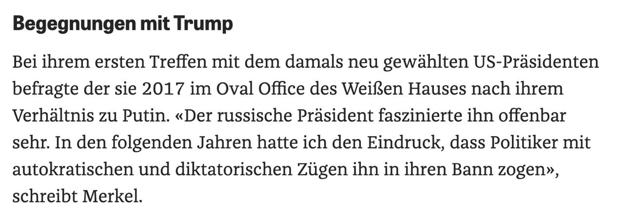 "Очевидно, він був дуже зачарований російським президентом. У наступні роки в мене склалося враження, що політики з авторитарними та диктаторськими рисами зачарували його", - пише Меркель.