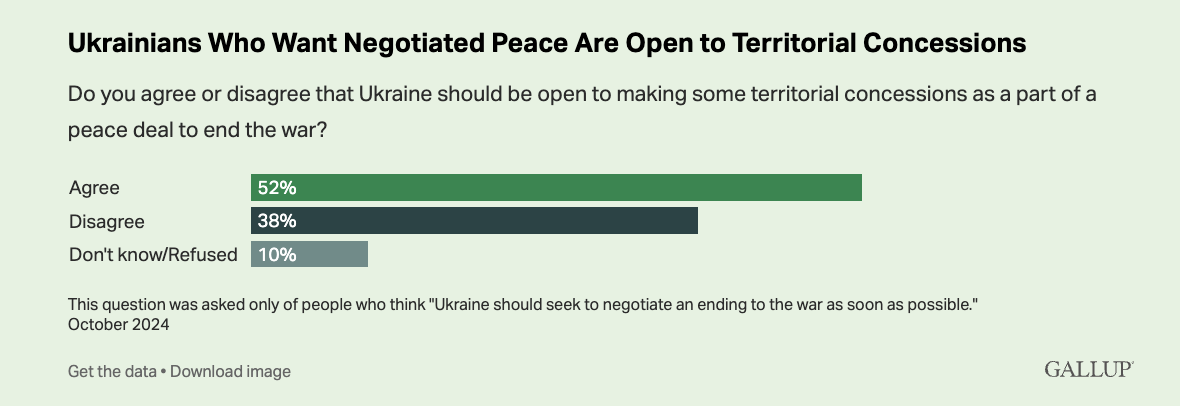 Такого погляду дотримуються 52% опитаних компанією Gallup українців. Вони вважають, що Україна має бути готова поступитися частиною території в обмін на світ. Тих, хто проти цього – 38% та ще десять відсотків не визначилися.
